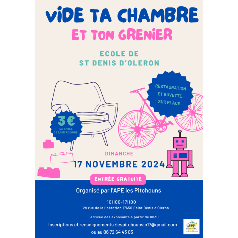 Nous vous attendons nombreux le 17 novembre pour le 3e vide ta chambre (et ton grenier) de l'ape les pitchouns de saint-denis/la brée !