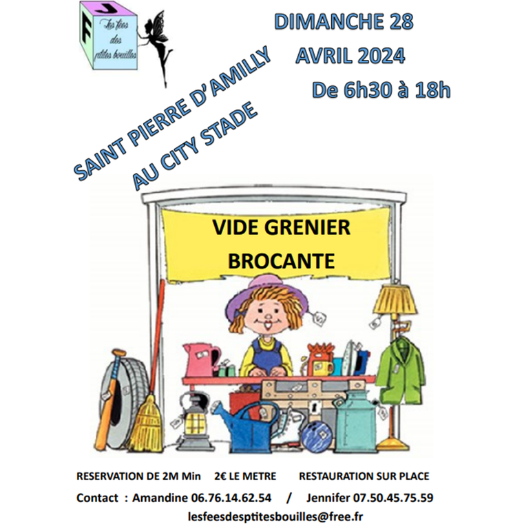 L’association les fées des p’tites bouilles son 1er vide grenier/brocante, le dimanche 28 avril 2023 au city stade de saint pierre de 6h30 à 18h.