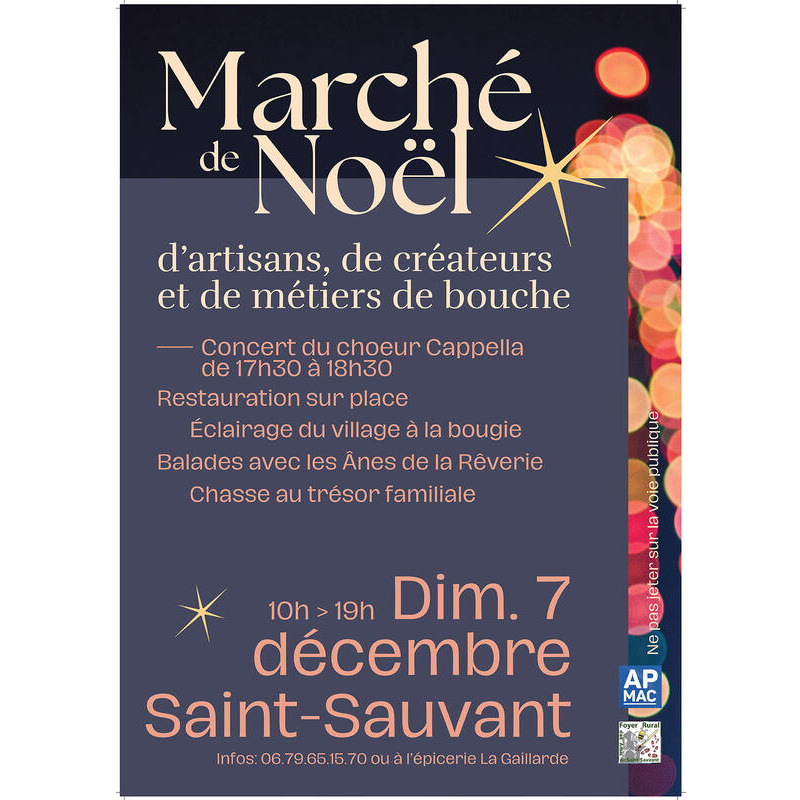 C’est un marché de noël atypique que le village de saint-sauvant vous propose de découvrir le long de ses ruelles illuminées à la bougie dès la tombée du jour. Le temps d’un dimanche, le 7 décembre, de 10h à 19h, créateurs, artisans et métiers de bouche seront présents dans l’un des plus jolis villages de charente-maritime bénéficiant du label « petite cité de caractère ». Vous pourrez entamer une balade avec les ânes de la rêverie, écouter les chants de noël interprétés par le choeur cappella dans son église romane à 17h30 (concert gratuit), participer à des animations pour enfant et profiter d’une restauration sur place.