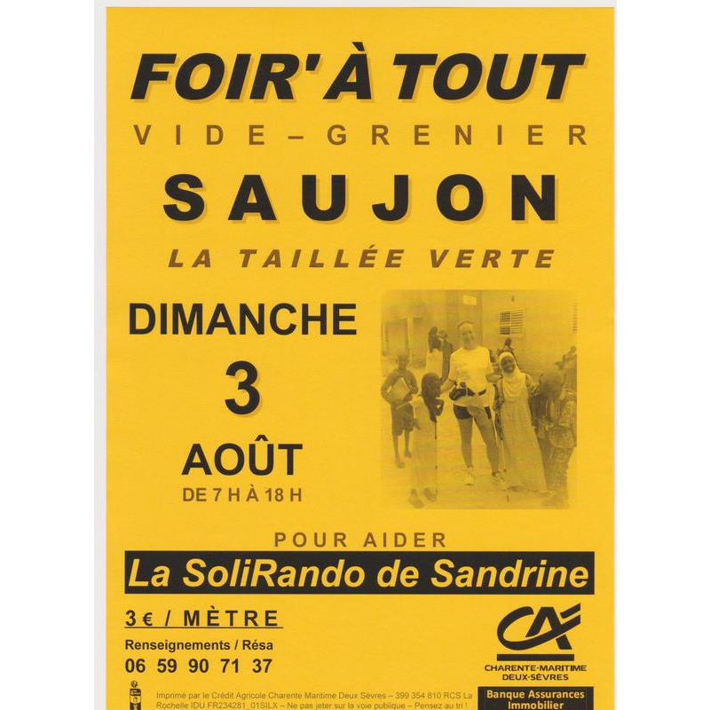 Vide grenier dont les bnéfices générés par le coût des emplacements aidera sandrine, saujonnaise malvoyante, à finanacer son prochain voyage humanitaire à madagascar, en faveur de l'éducation scolaire des enfants. Sandrine distribura livres et fournitures scolaires grâce à votre aide.
