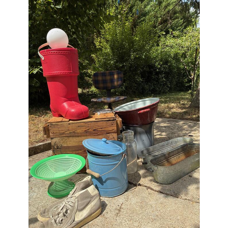 Vide grenier dans notre jardin : dame jeanne, vieilles caisses en bois, bibelots, verrerie, banquette roche bobois des années 70, miroirs, fauteuil, vieille bassine zinc, ancien garde-manger, lampe... Bref pas mal de chose et surtout tout doit disparaître ! (bien plus que sur la photo)