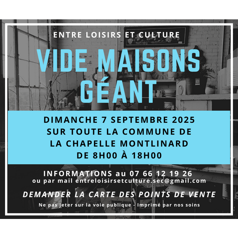 Vide maisons geant sur toute la commune de la chapelle montlinard le dimanche 7 septembre 2025 de 8h00 à 19h00 - gratuit pour les visiteurs - plus de 20 maisons participent demandez la carte des points de vente par sms ou par mail () suivez nous sur facebook entre loisirs et culture