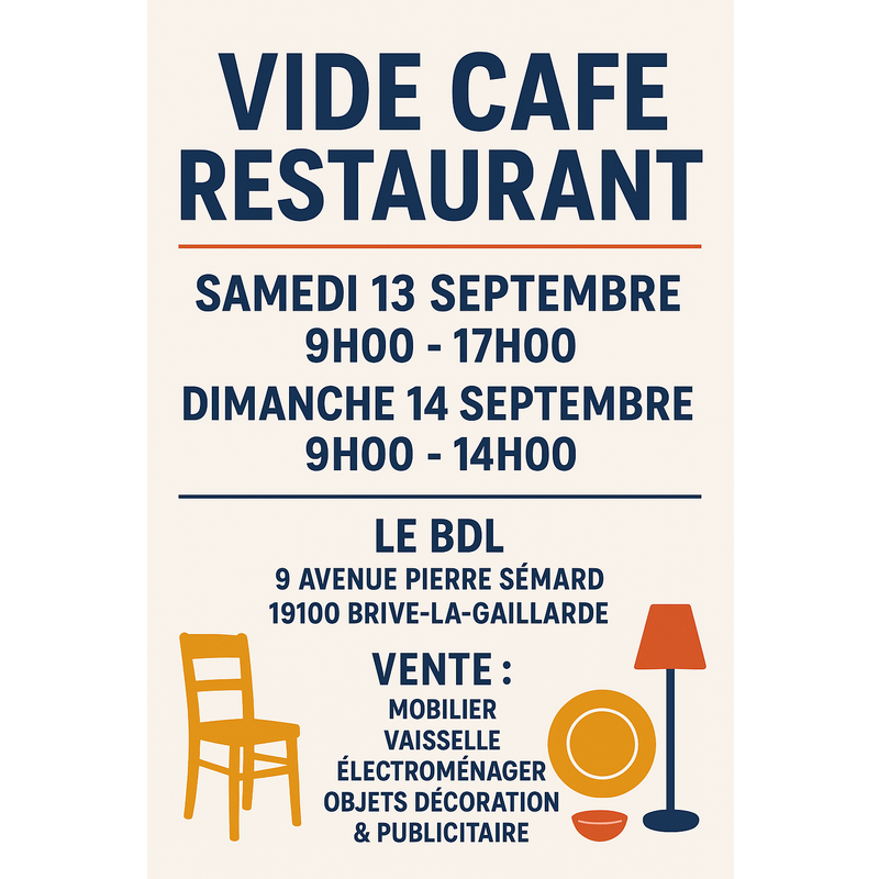 Le bdl ayant fermé ses portes le 22 août dernier, nous organisons un vide bar/restaurant. Vous pourrez y retrouver de la vaisselle, de l'électroménager professionnel ou familial, du mobilier, des objets de décoration et publicitaire...