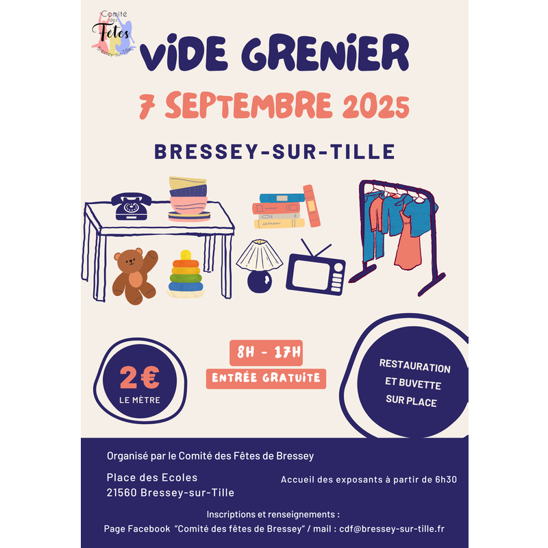 Le cdf de bressey propose son vide-grenier annuel au profit des animations du village. Buvette et restauration sur place.