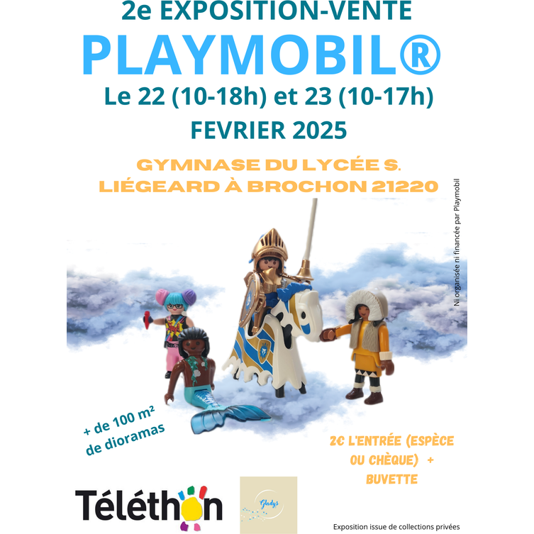 L’association gladys organise une exposition vente playmobil sur plus de 100 m². Les bénéfices réalisés avec le prix des entrées et la buvette seront reversés au téléthon. On pourra déguster de bonnes crêpes ou des biscuits en forme de playmobil. Les visiteurs pourront également ramener des souvenirs ou agrandir leur collection grâce à l’espace vente. Les exposants seront au nombre de 10 et installeront des scènes sur différents thèmes comme les magiciens, l’histoire ou mariokart (et bien d’autres). L’exposition se tiendra dans le gymnase du lycée stephen liegeard (brochon), avec l’aide de lycéens volontaires et de bénévoles déterminés. Cela se déroulera le samedi 22 février de 10 à 18h et le dimanche 23 février de 10 à 17h. Nous vous espérons nombreux.Ses, amis de vos enfants, grand-parents, tout le monde sera ravi.