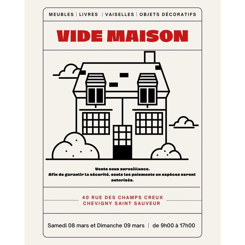 Voici une petite annonce pour un vide maison située au 40 rue des champs creux à chevigny saint sauveur. Début 9h00 fin a 17h00. Le week-end du samedi 8 et dimanche 9 mars 2025.