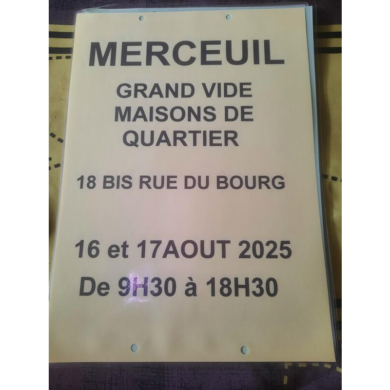 Vide maison de quartier , tout les voisins exposent au.Meme.Lieu 18 bis rue du bourg vous y trouverez petit.Meuble, petit électroménager, outils, matériels, bibelots anciens et vintage, vaisselle, linge ancien, jeux enfants,.Petites voitures de collection, playmobil vêtements hommes et femmes, chaussures, bijoux fantaisie etc.... Annule