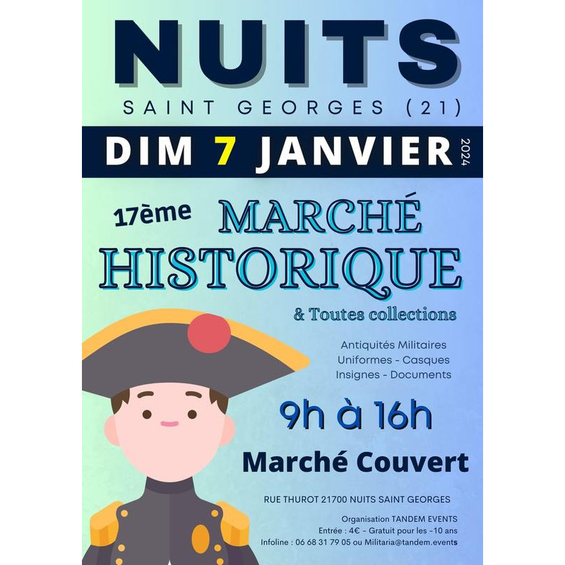Ne manquez pas le 18ème marché historique et toutes collections au marché couvert de nuits saint georges le dimanche 5 janvier 2025 de 9h à 16h.