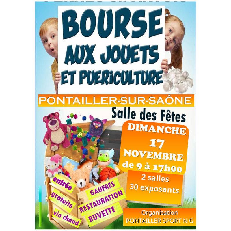 A la traditionnelle bourse aux jouets, nous ajoutons cette année la puériculture (de 0 à 12 ans). Plus d'une trentaine d'e stands dédiés à la vente de jouet, jeux, livres, ;;; auxquels se joindront vêtements et petits matériels pour enfants, en excellent état et bien sûr à tout petit prix. Accueil chaleureux, entrée gratuite, gaufres, vin chaud, tombola, parking à proximité. Portes ouvertes de 09h00 à 18h00. A très vite !!!