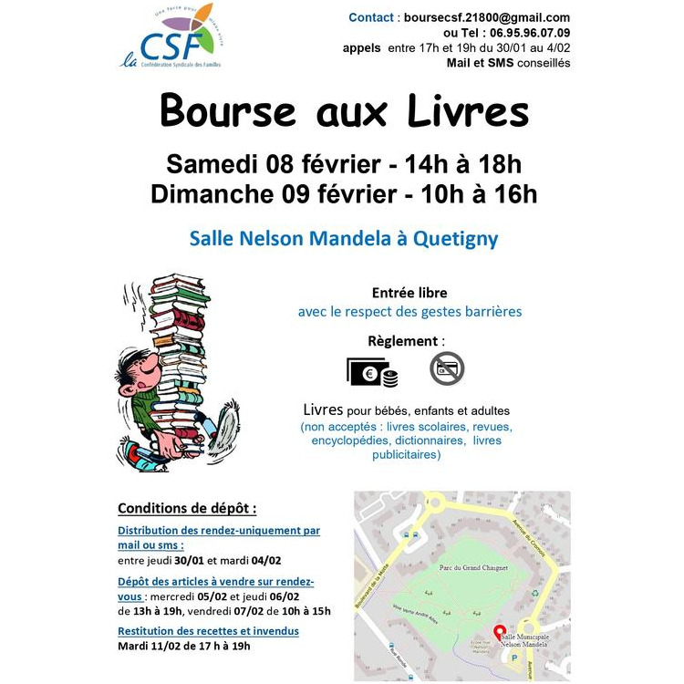 possibilité de déposer les livres. Les dépôts se font obligatoirement sur rendez-vous. Un rendez-vous par liste déposée (24 articles). Les demandes de rendez-vous se feront, de préférence par mail ou sms, à partir du jeudi 30 janvier jusqu’au mardi 4 février. Dépôt de mercredi 05 à vendredi 07/02. Retour de non vendu mardi 11/02