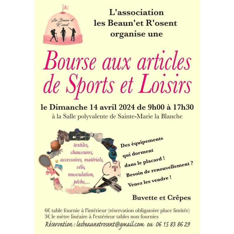 L'association "les beaun'et r'osent" vous invite à sa bourse aux articles de sports et de loisirs qui se tiendra dimanche 14 avril à la salle polyvalente de sainte-marie-la-blanche, de 9 h à 17 h 30.