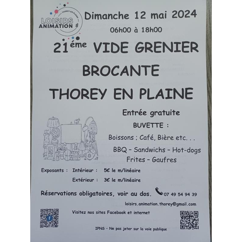 A thorey en plaine vide grenier le 12 mai 2024 salle polyvalente (direction st jean de losne sur la rd968 aux feux prendre à droite rue du bois) - de 8h à 18h - entrée gratuite -