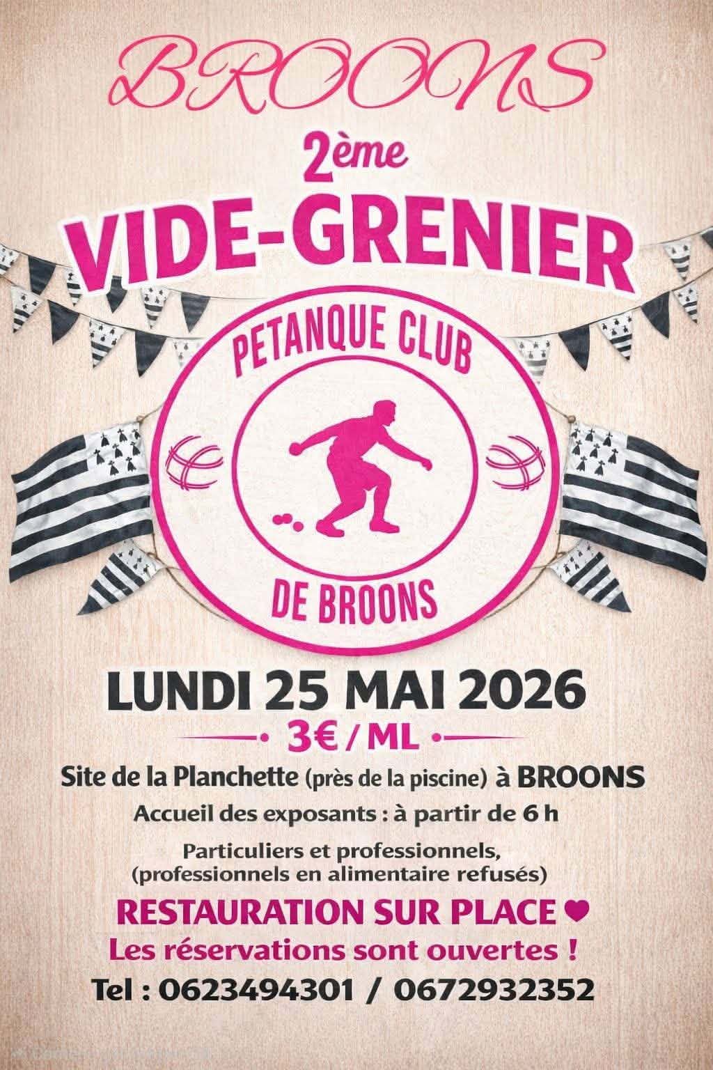 2 ème vide greniers du Pétanque club de Broons sur le site de la planchette ( pres de la piscine municipale ), restauration et buvette sur place , toilettes . Particuliers et professionnels ( sauf alimentaire ) café offert / emplacement . Véhicule accepté sur l'emplacement .