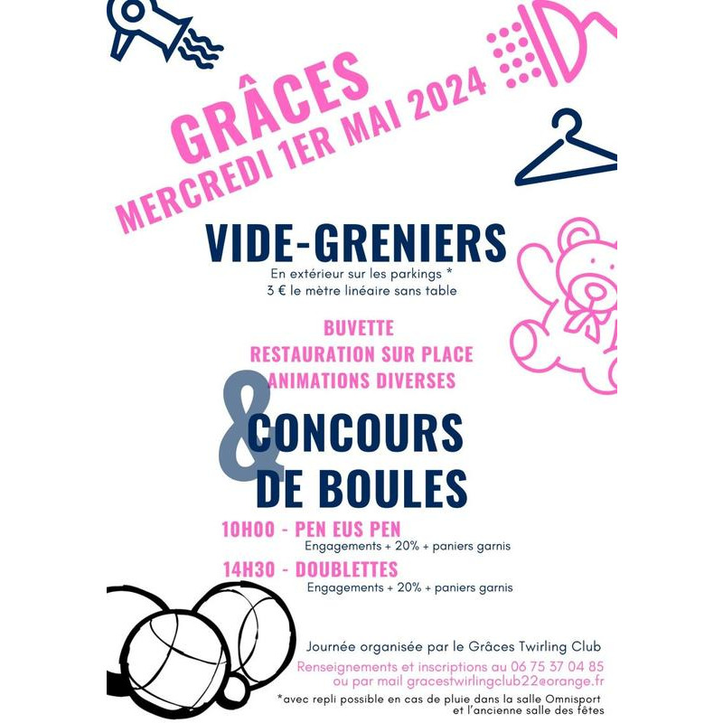 Le grâces twirling club organise son 1er vide-greniers extérieur sur les parkings de la salle multiculturelle et autour du boulodrome le mercredi 1er mai 2024.