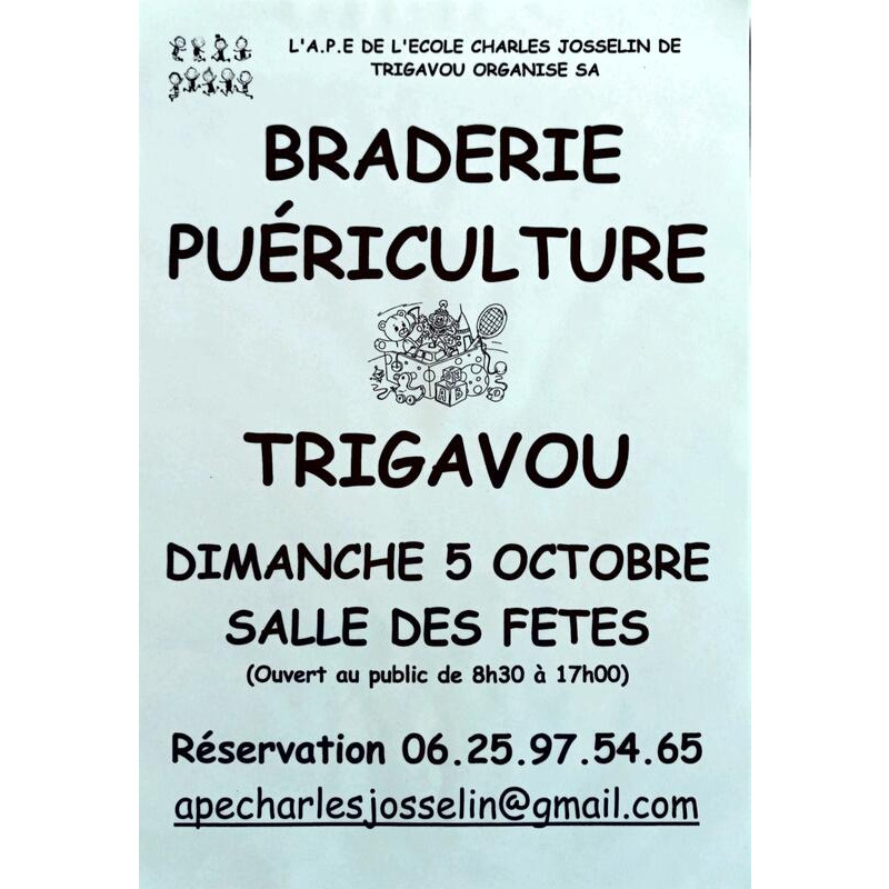 L'ape de l'école charles josselin de trigavou organise sa traditionnelle braderie puériculture. Venez faire de bonnes affaires.