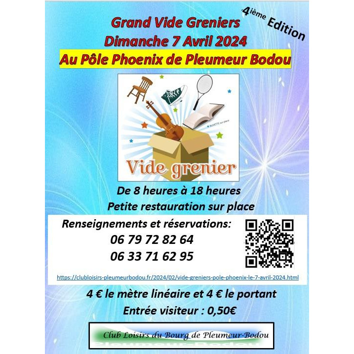 Réservation : https://clubloisirs-pleumeurbodou.fr/2024/02/vide-greniers-pole-phoenix-le-7-avril-2024.html