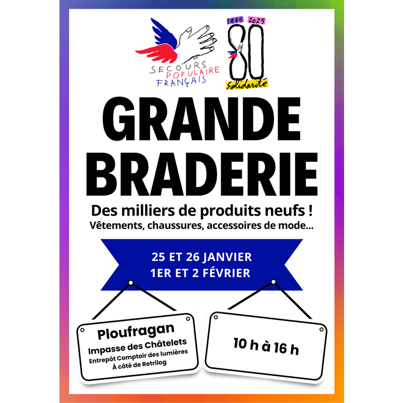 La fédération des côtes d'armor du secours populaire organise une grande braderie à ploufragan le dernier week-end de janvier et le premier week-end de février.