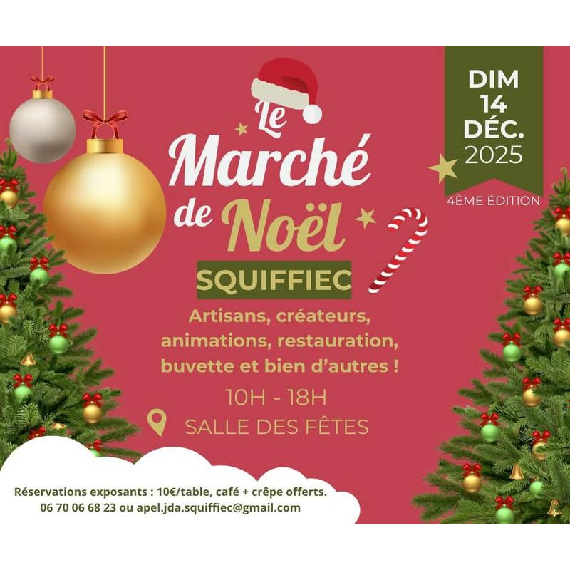 L'été bat son plein, et déjà la magie de noël se prépare en coulisse... Nous sommes ravis de vous annoncer que le marché de noël revient à squiffiec pour sa quatrième édition ! Rendez-vous incontournable des petits et des grands, nous recherchons dès à présent nos exposants ! (modalités d’inscription ci-dessous) dimanche 14 décembre 2025, de 10h à 18h à la salle des fêtes au programme : contes de noël enchantés visite du père noël créateurs et artisans locaux restauration, bar, gourmandises… et bien plus encore ! Exposants, les inscriptions sont ouvertes ! Vous êtes artisan, créateur, passionné ? Venez partager votre univers dans une ambiance conviviale et festive ! 10€ la table (avec café + crêpe offerts ) réservations et par mail : on a hâte de vous retrouver pour faire briller les yeux des enfants et réchauffer les cœurs n’hésitez pas à partager l’info et à inviter vos amis !