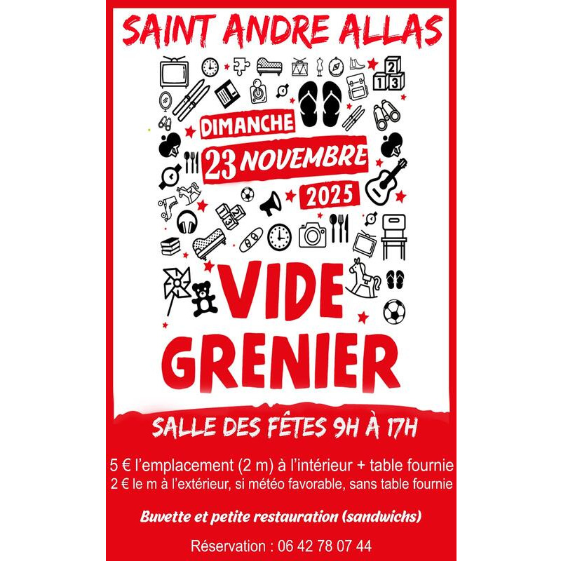 Vide grenier le dimanche 23 novembre 2025 à la salle des fêtes de st andré allas 24200, de 9h à 17h .