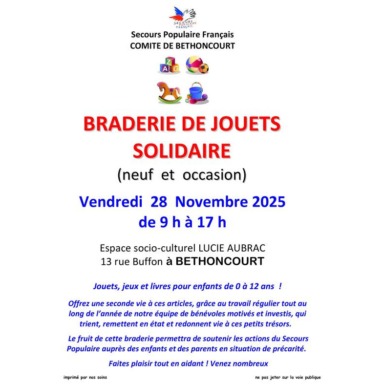 Le comité du secours populaire de bethoncourt organise une braderie de jouets (neufs et d'occasion) à très petits prix