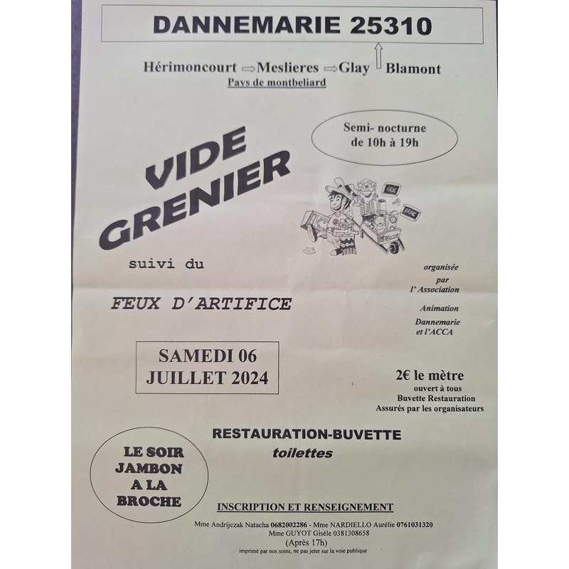 En semi nocturne de 10h à 19h, buvette et restauration sur place, jambon à la broche uniquement le soir et feux d'artifices dès 22h, toilettes.