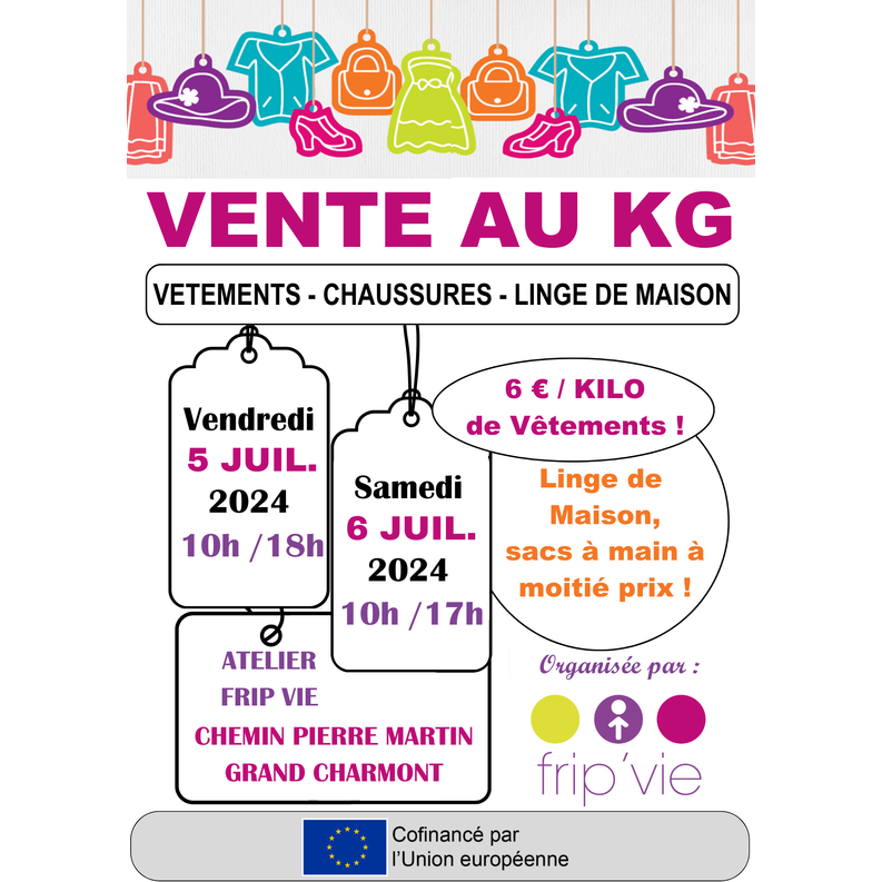 Vente au kilo le vendredi 5 juillet de 10h à 18h et le samedi 6 juillet 2024 de 10h à 17h.