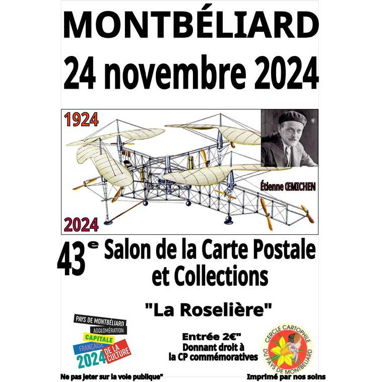 43e salon de la carte postale et collection le 24 novembre 2024 à la roselière de montbéliard 60 exposants professionnels et particuliers, restauration bar exposition sur les 73 communes de pma cfc 2024