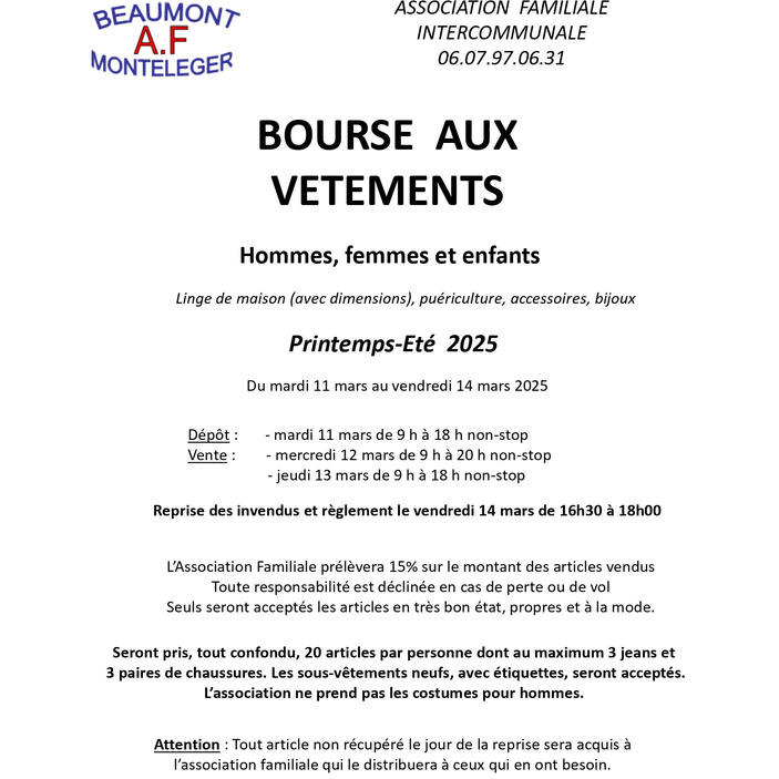 Bourse aux vêtements (hommes, femmes et enfants), linge de maison, puériculture, accessoires, bijoux.