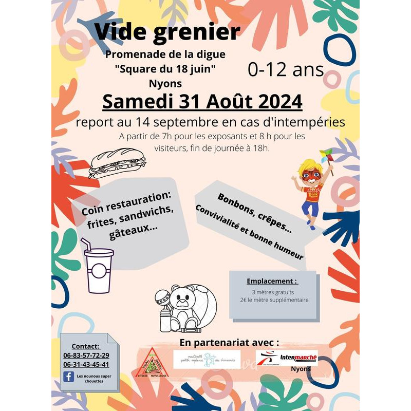 Vide grenier spécial bébé 0/12ans gratuit jusqu'à 3 metres. Puis 2 euros le mètre supplémentaires. Buvette sandwichs frites crêpes.....