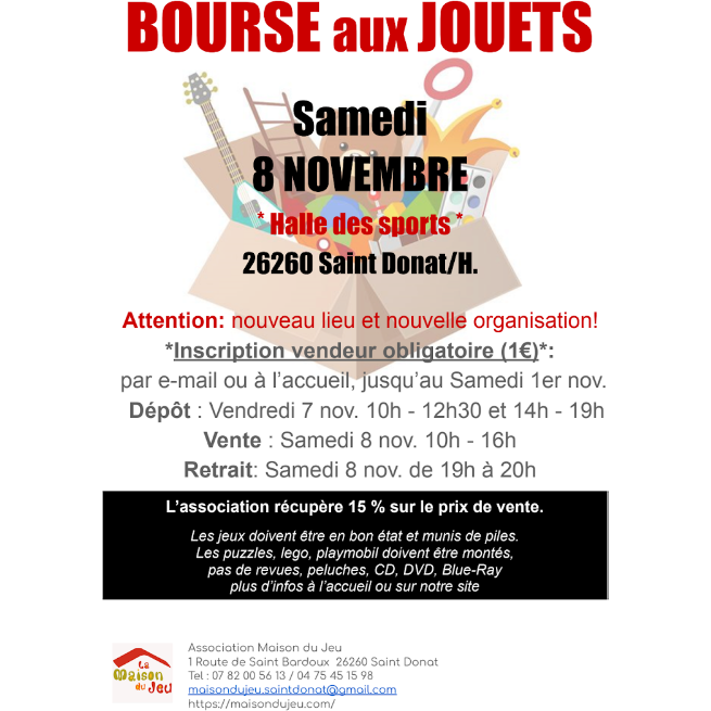 La maison du jeu organise sa traditionnelle bourse aux jouets les 7-8 novembre 2025 à la halle des sports de saint-donat.