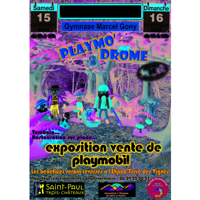 1 ère exposition vente playmobil sur la commune de saint paul trois châteaux, organisé par l’association playmo’drôme. Buvette et petite restauration sur place réservé à l’organisation. Tombola sur les deux jours. La manifestation est complète pour les exposants et réservé aux membres de l’association et leur invités. Ouverture au public: le samedi 15 : 9h-19h le dimanche 16 :9h-18h tarif 2€, gratuité pour les enfants de moins de 10 ans.