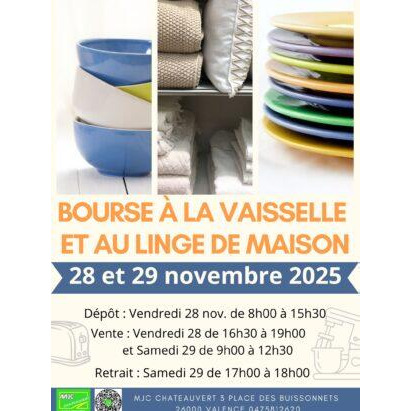 Vendredi 28 et samedi 29 novembre, nous organisons la traditionnelle bourse à la vaisselle et linge de maison à la mjc châteauvert !