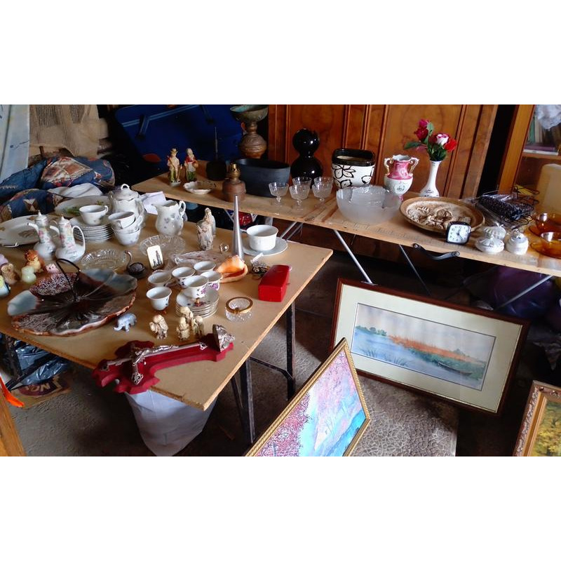 1 bouilloire, 1 cafetière, 1 commode, 1 desserte, 1 glacière, 1 table d'appoint, 1 guéridon, 1 buffet, 1 lit bébé, 1 lit une personne, 1 chaise de château, 2 bureaux stratford, 1 armoire, 1 vitrine, plusieurs vases, bibelots, tableaux, cadres, sacs, luminaires, vinyles, dvds, livres, services à vaisselle anciens, vêtements, chaussures, téléphones, parure de lit, coussins, rideaux, couverts, photos anciennes, négatifs anciens, bijoux fantaisies, poupées de collection, jeux, jouets etc....
