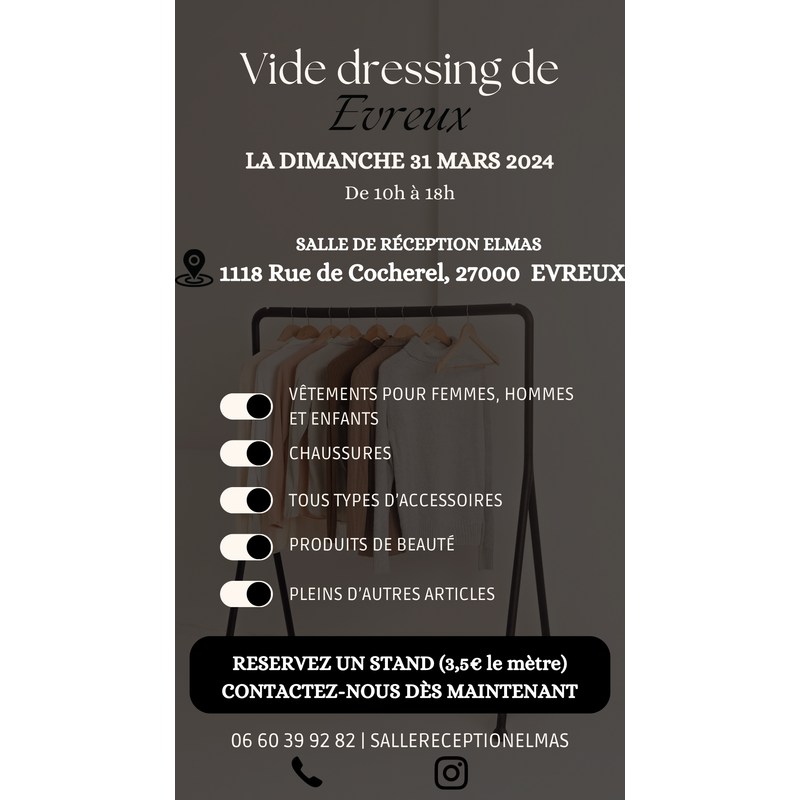 Vide dressing, vêtement femmes, hommes et enfants. Restauration et buvette sur place, salle de jeu pour enfant.