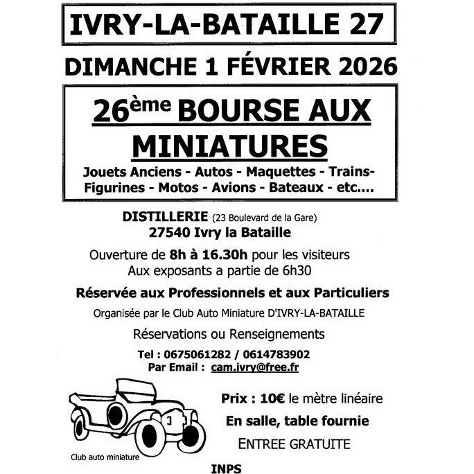 26e bourse aux miniatures et jouets anciens dimanche 01 février 2026 à ivry la bataille 27 jouets anciens - autos - maquettes - trains- figurines - motos - avions - bateaux – etc. Réservée aux professionnels et aux particuliers. A la salle polyvalente d’ivry la bataille horaire visiteurs de 8h à 16.30h. Ouvertures des portes aux exposants à 6h30 organisée par le club auto miniature d'ivry la bataille.