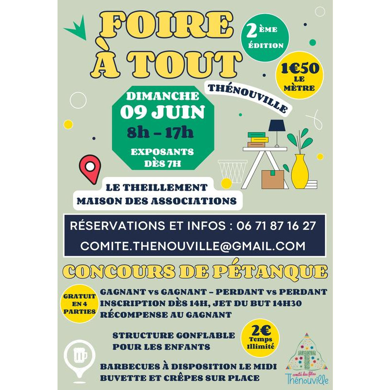 Le comité des fêtes de thénouville organise une foire à tout et un concours de pétanque le dimanche 9 juin 2024. Les exposants pourront s'installer à partir de 7h et les visiteurs à partir de 8h. Prix du mètre : 1€50