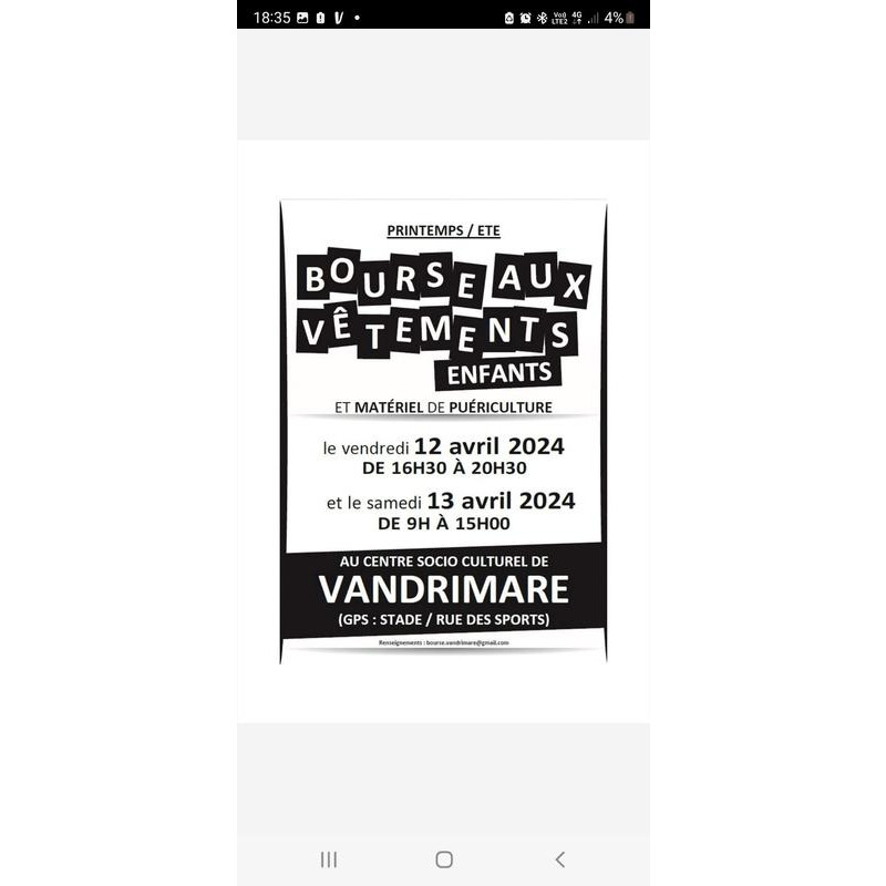 Bourse aux vêtements printemps/été enfants et matériel de puériculture et jouets organisé par l'acape (association de parents d'élèves des écoles de vandrimare et bourg-beaudouin).
