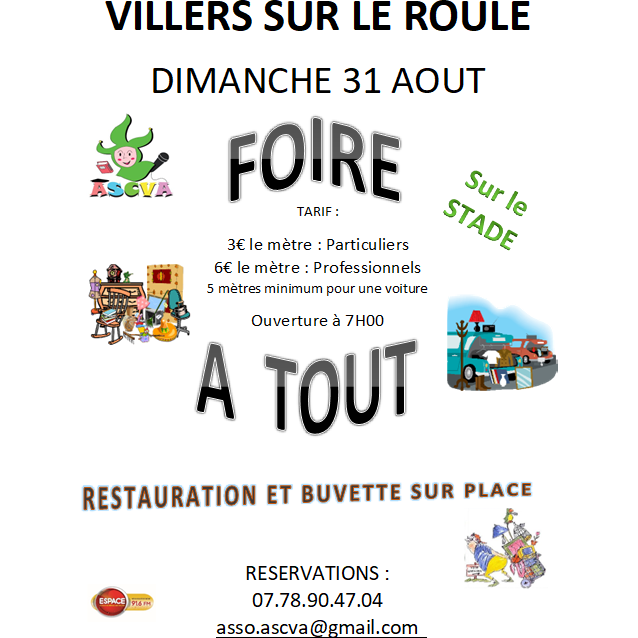 Vide-greniers et marché aux puces - Villers-sur-le-Roule de 8h à 18h Particuliers : 3€ le mètre Professionnels : 6€ le mètre 5 mètres minimum pour une voiture Ouverture aux exposants à 7h00 Restauration et buvette sur place