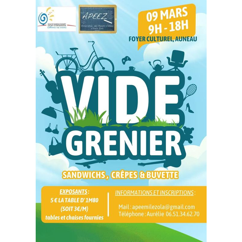 Vide grenier organisé par l'ape au profit de l'école primaire émile zola. Parking à proximité. Sur place : commodités et buvettes. Les tables et les chaises sont fournies.