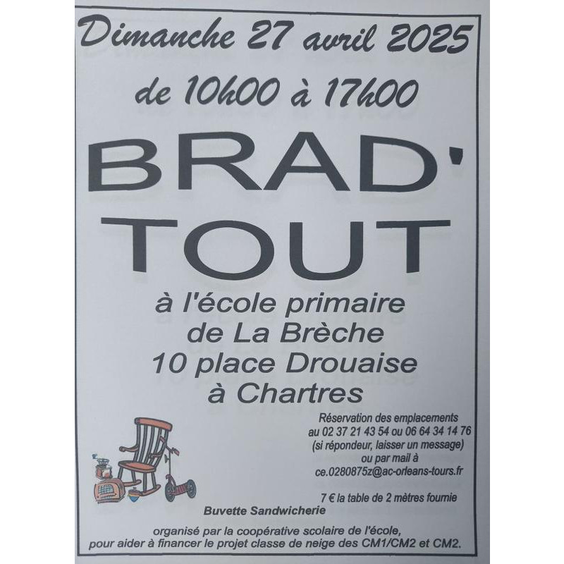 Vide-greniers et marché aux puces - Chartres De 10h00 à 17h00 Vide grenier ouvert à tous pour aider au financement de la classe de neige des élèves de CM1-CM2 et CM2 de l'école de La Brèche. L'emplacement de 2m est loué avec une table pour 7€. Coin buvette/restauration sur place avec possibilité de commander son panier repas à l'avance. Installation à partir de 8h00. Ouverture aux chineurs de 10h00 à 17h00. Inscription dès maintenant auprès du secrétariat de l'école par téléphone ou par mail.