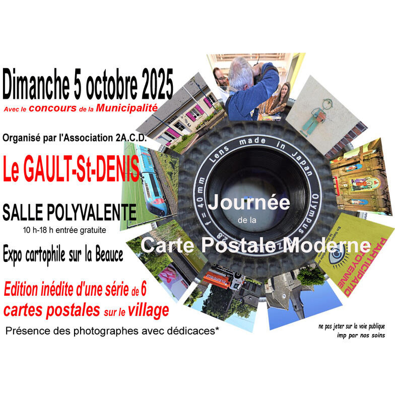 6 stands uniquement des centaines de cartes postales modernes. Edition et ventes d'une série de 6 cartes postales représentant des lieux et des personnages résidant à le gault-st-denis en 2025. Exposition de cartes postales sur la beauce.