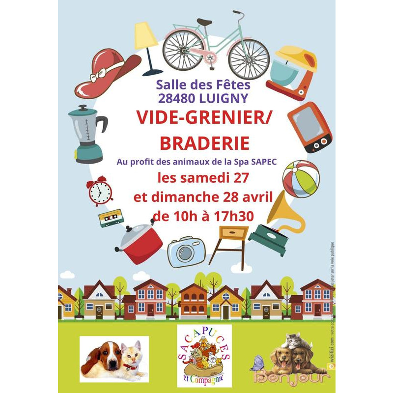 "les samedi 27 et dimanche 28 avril, vide grenier/braderie de printemps au profit des animaux de l'apa sapec. Vaisselle, décoration, petit électro ménager, linge, jouets, accessoires animaux, etc... Salle des fêtes de luigny 28480 de 10h à 17h30. "