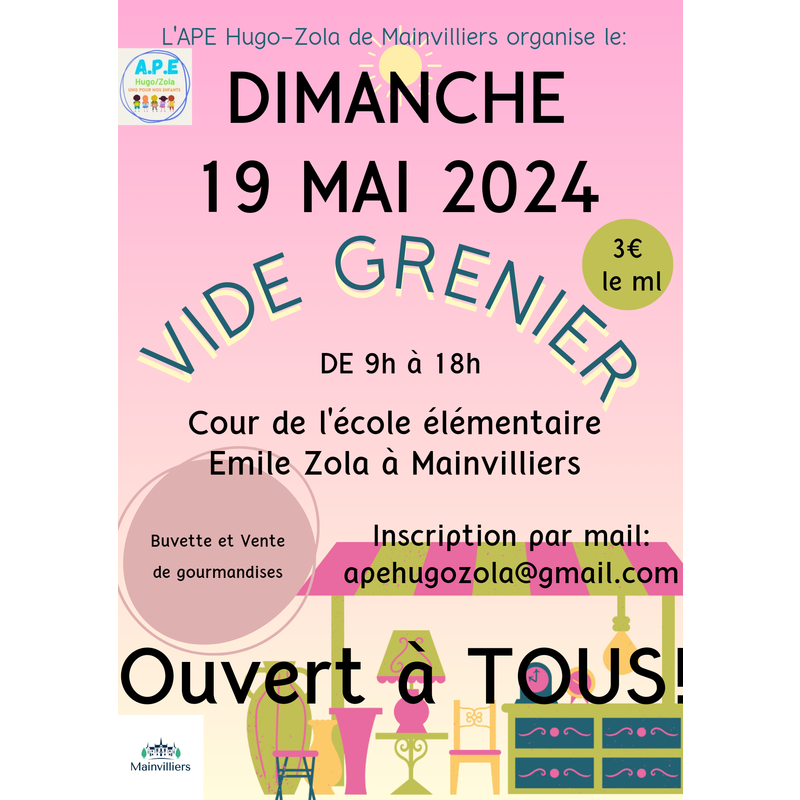 1er vide grenier organisé par l'ape hugo-zola de mainvilliers dont l'intégralité des bénéfices iront aux élèves du groupe scolaire hugo-zola mainvilliers.