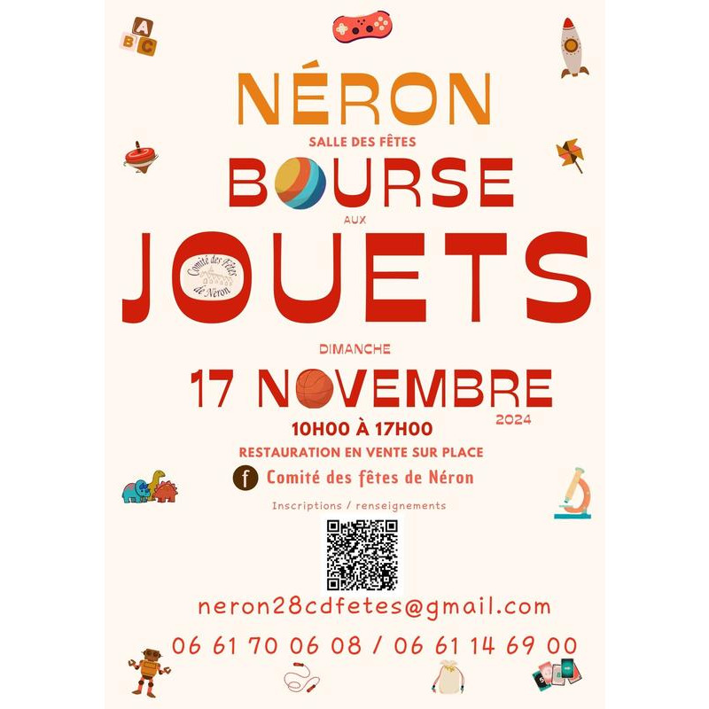 Dimanche 17 novembre 2024, de 10h00 à 17h00, dans la salle des fêtes de néron, rue de feucherolles, bourse aux jouets.