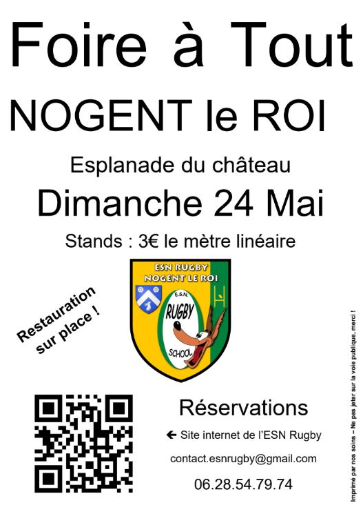 L'ESN Rugby organise sa Foire à Tout le 24 Mai 2026 de 9h à 18h sur l'Esplanade du Château de Nogent le Roi.