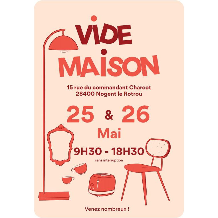 Vente de meubles, vaisselle, bibelots, électro-ménager, outils de jardinage et matériel de pêche.