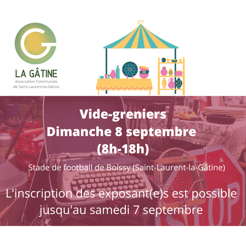 L'association la gâtine organise comme chaque son vide-greniers à st-laurent-la-gâtine (hameau de boissy, stade de football). Toute la journée, l'équipe de la gâtine vous propose une restauration et une buvette sur place. Nous attendons entre 30 et 40 exposants, dont l'emplacement est gratuit pour eux.