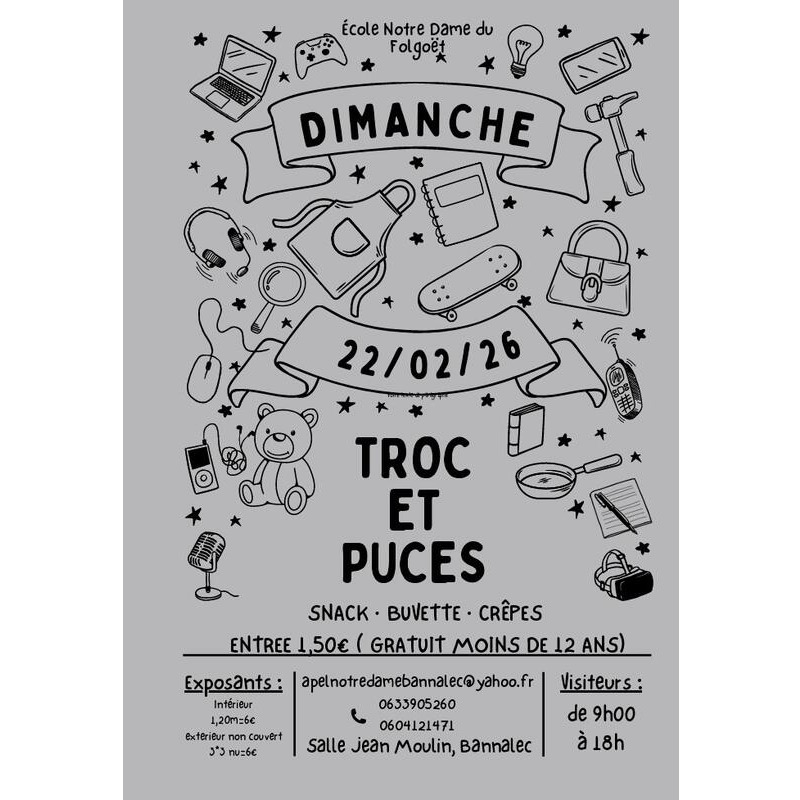 Troc et puces, organisé par l'apel de l'école notre dame de bannalec, petite restauration sur place