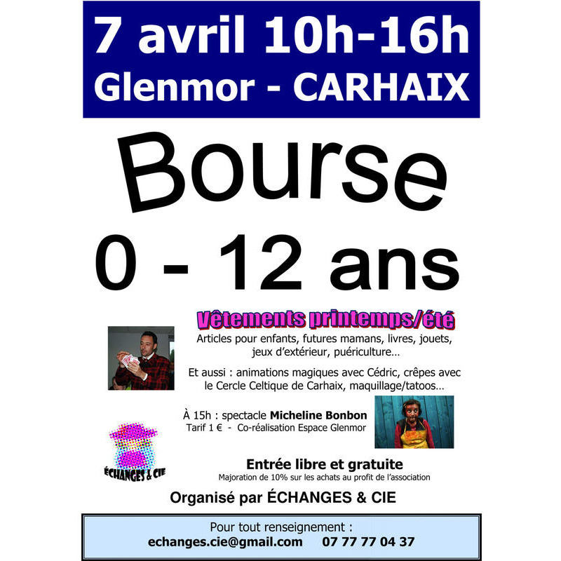 Spectacle à 15h en collaboration avec l'espace glenmor : micheline bonbon. Tout public à partir de 6 ans. Tarif : 1 €.