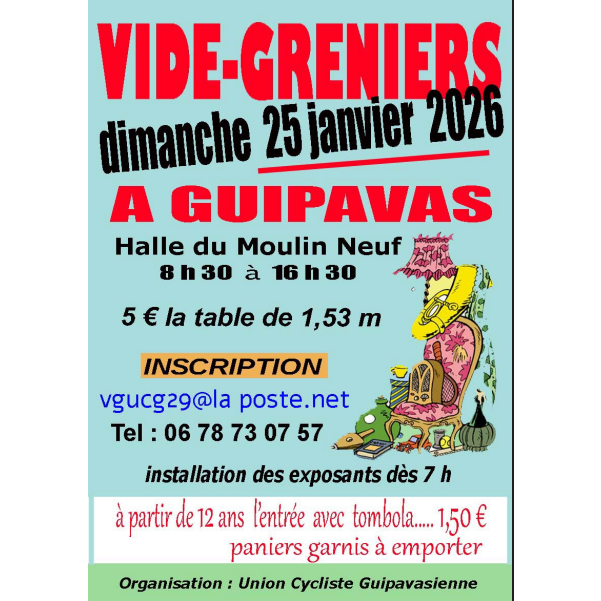 L'union cycliste guipavasienne organise son vide grenier le dimanche 25 janvier de 8h30 à 16h30 à la halle du moulin neuf à guipavas. Petite restauration sur places. Panier garni à gagner.